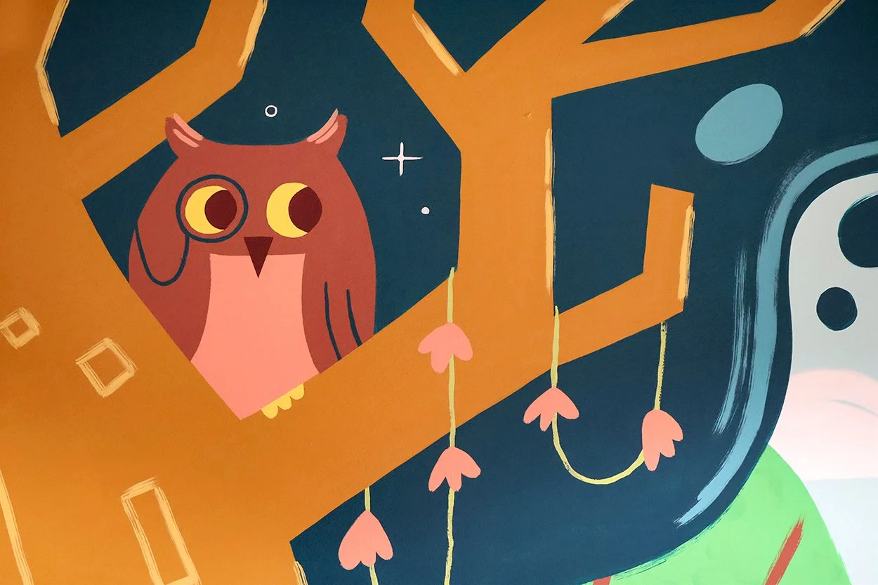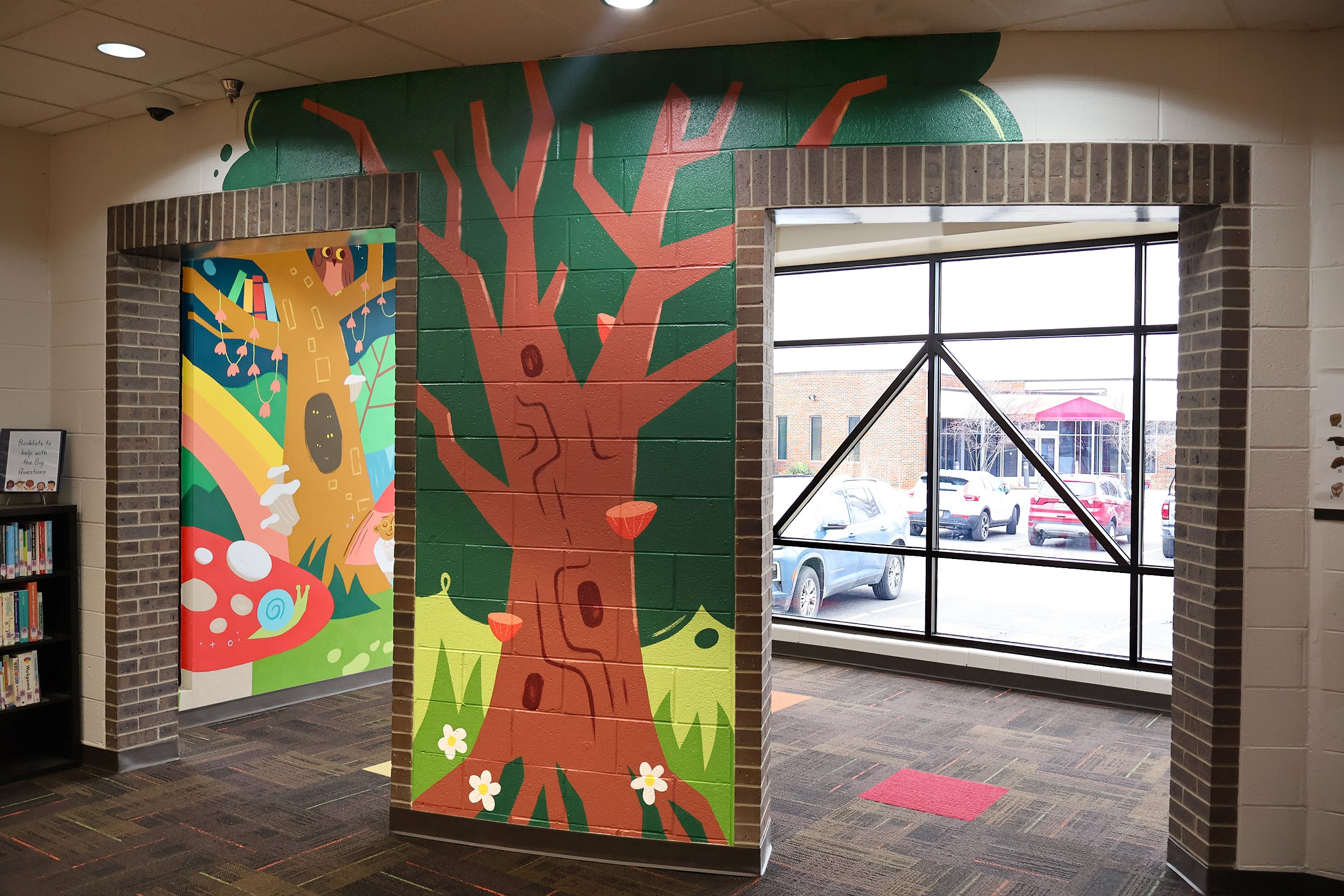This whimsical enchanted forest scene activates the children’s alcove of the library. Tying together existing library colors and fairytale motifs, this design features lovable characters, magical surprises, and even an interactive tree! Located on the entrance to the alcove, children will add a leaf to the tree once they complete the “1000 Books Before Kindergarden” reading challenge.